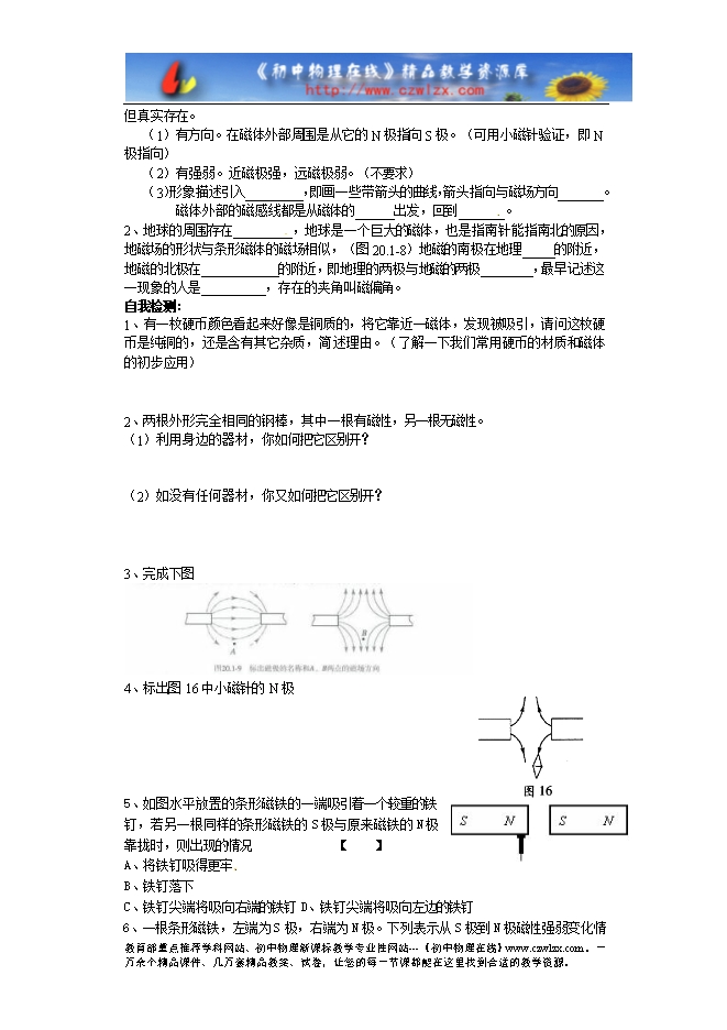 2、磁体各部位的吸引能力不同,把最强的部位叫_______,图20.1-3条形磁体两端的磁性_____,中央最弱;每个磁体有____个磁极,其中一个磁极叫南极或S极,另一个磁极叫______或_____极,确定方法:悬吊的磁体或在水平面上 可以自由转动的磁体,______时 指南方的那个磁极是______,同时指北方的那个磁极是____。(演示)