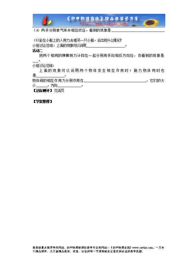 2.一个力必然涉及至少 个物体,一个是 物体,另一个就是 物体。施力物体对受 力物体施力的 也受到了受力物体对它的 。物体间力的作用是 。