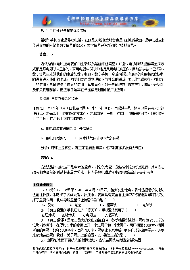 方法总结:电磁波与我们的生活联系是越来越紧密。广播、电视和移动通信等通信方式都是靠电磁波来工作的,家用电器中微波炉也是利用电磁波工作。目前数字技术已成熟,数字信号已走进我们的生活如数字电视、数字手机。今后可能还有更多的利用电磁波技术的设备进入我们的生活,同学们要注重物理知识与社会的联系,要记住电磁波在不同地方中的应用。电磁波是“信息的应用”章节重点,对于电磁波应了解其产生、传播、分类以及相关物理参数,更应该了解其在传递信息过程中的广泛应用。