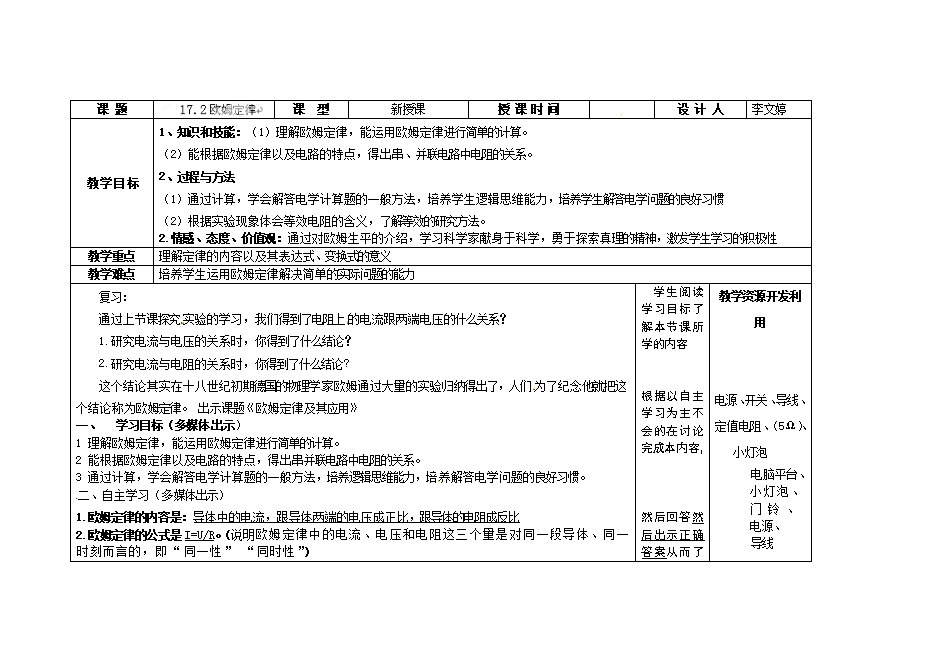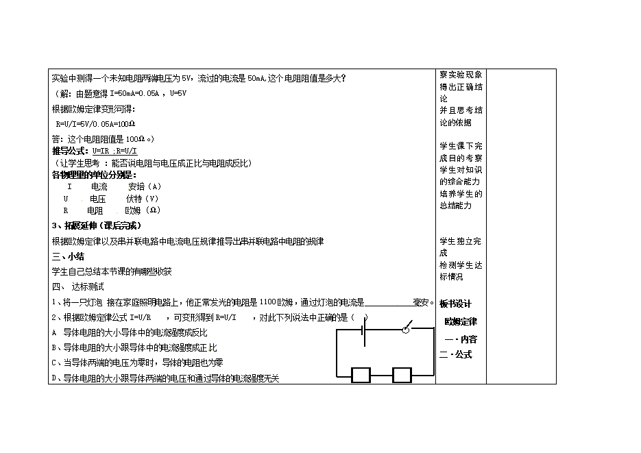 2.情感、态度、价值观:通过对欧姆生平的介绍,学习科学家献身于科学,勇于探索真理的精神,激发学生学习的积极性
