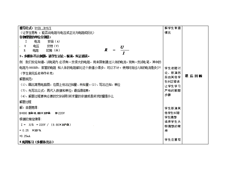 2.欧姆定律的公式是I=U/R。(说明欧姆定律中的电流、电压和电阻这三个量是对同一段导体、同一时刻而言的,即“同一性” “同时性”)