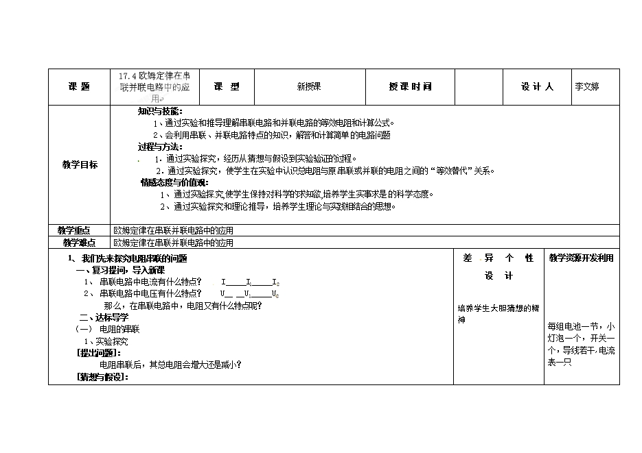 吉林省长春市第一零四中学人教版九年级物理教案-17.4欧姆定律在串联并联电路中的应用