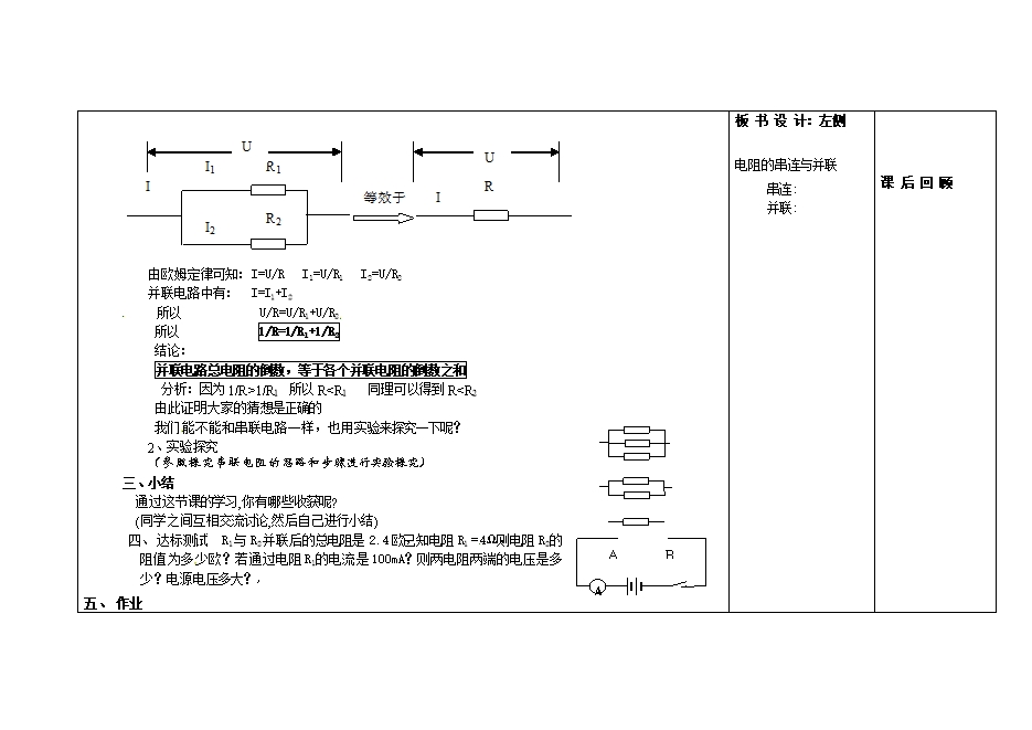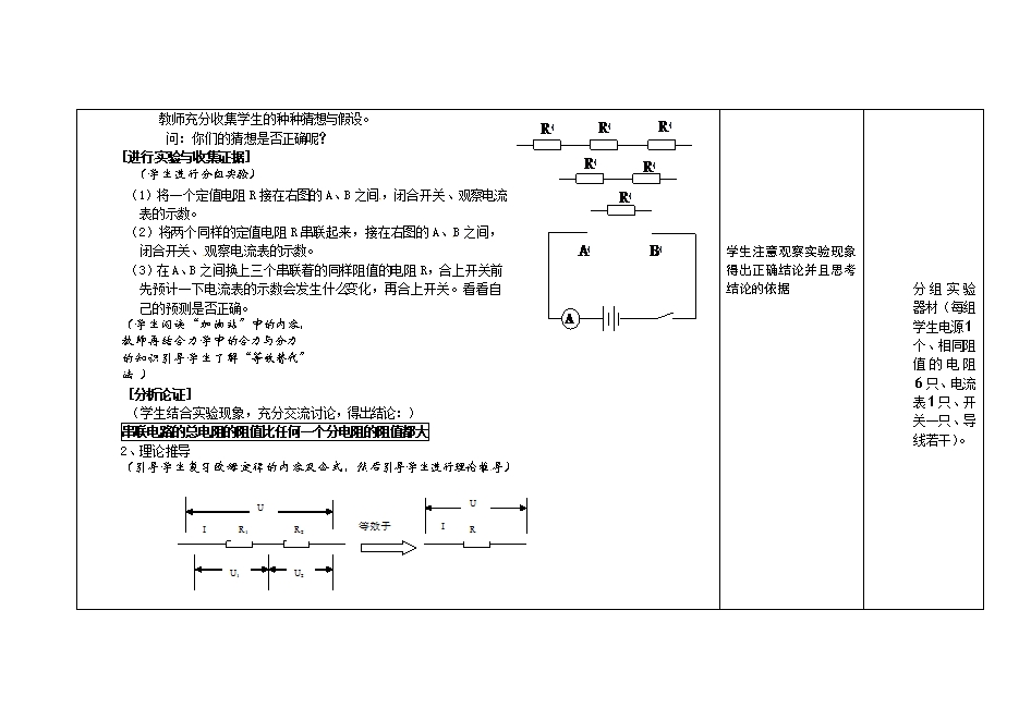 2.通过实验探究,使学生在实验中认识总电阻与原 串联或并联的电阻之间的“等效替代”关系。