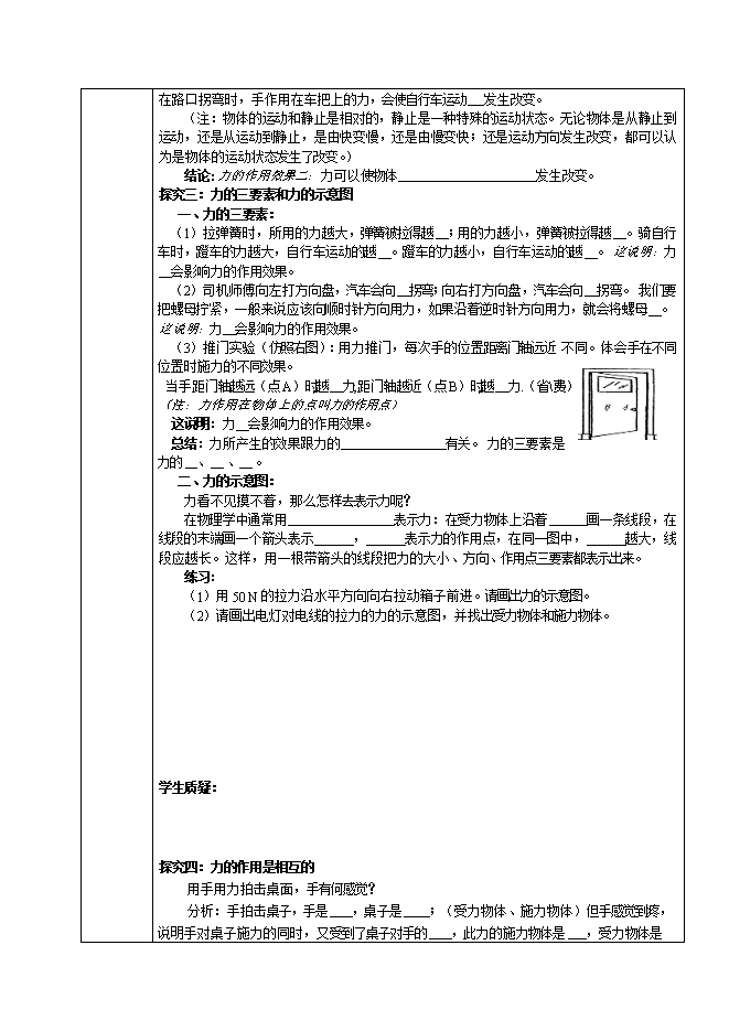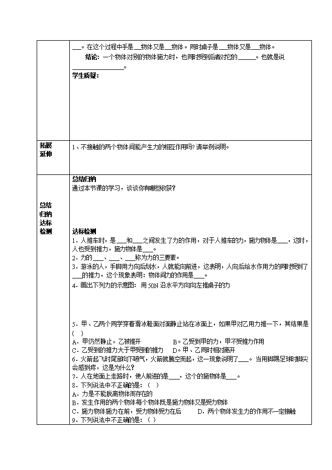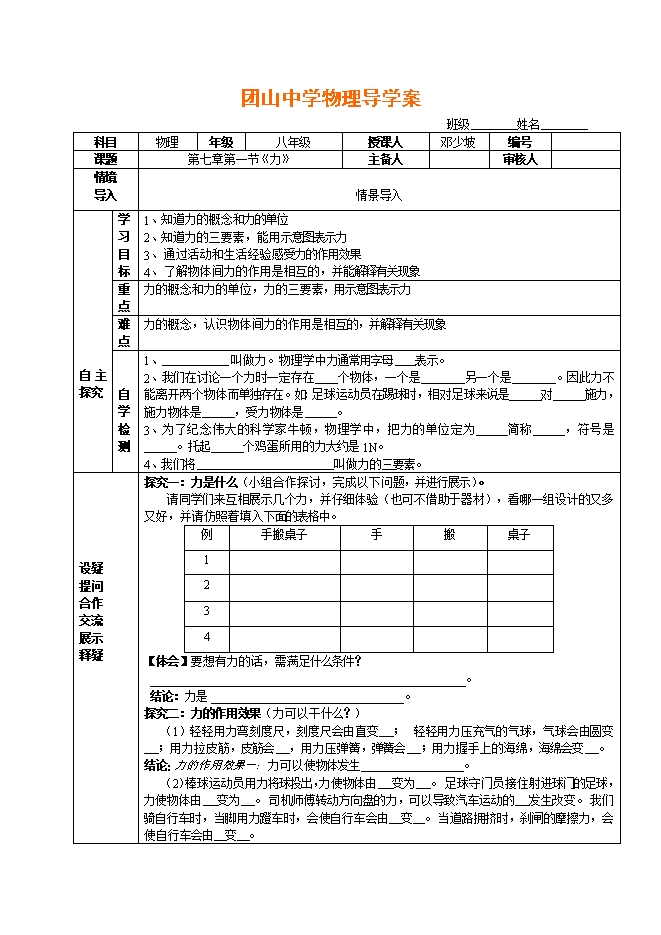 湖南省团山中学新人教版物理八年级下册《7.1力》导学案