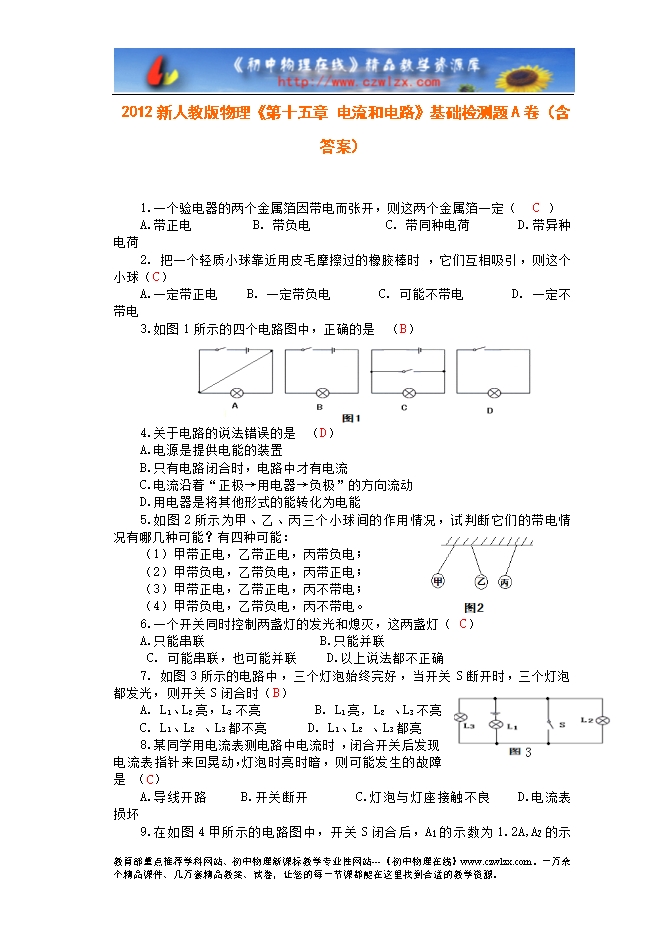 2012新人教版物理《第十五章 电流和电路》基础检测题A卷(含答案)