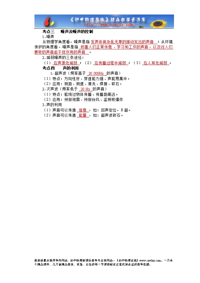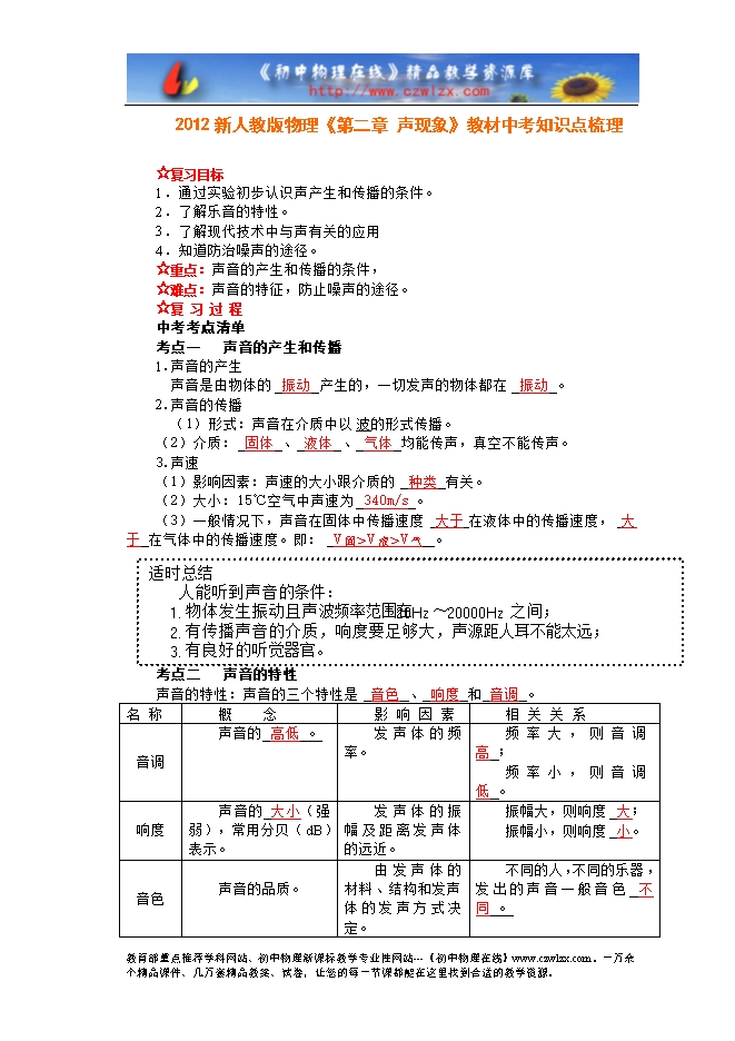 2012新人教版物理《第二章 声现象》教材中考知识点梳理