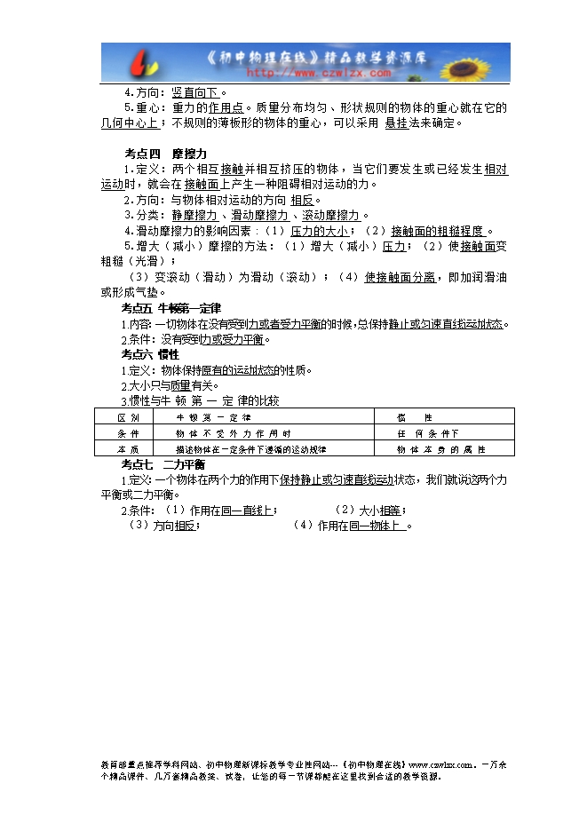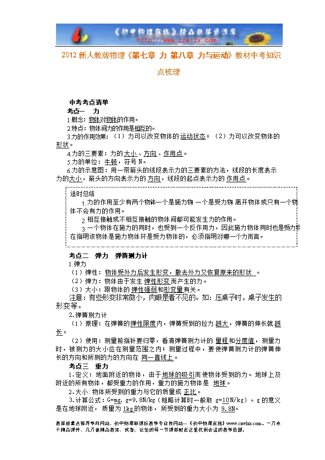 2012新人教版物理《第七章 力 第八章 力与运动》教材中考知识点梳理