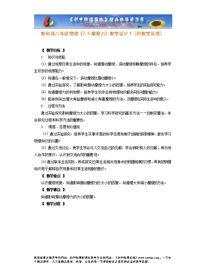 (4) 知道摩擦力的利和弊,培养学生初步应用物理知识解决实际问题的能力;