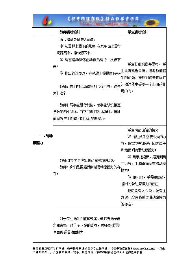 (1) 通过观察日常生活中的现象,知道滑动摩擦、滚动摩擦和静摩擦的存在,培养学生初步的观察能力;