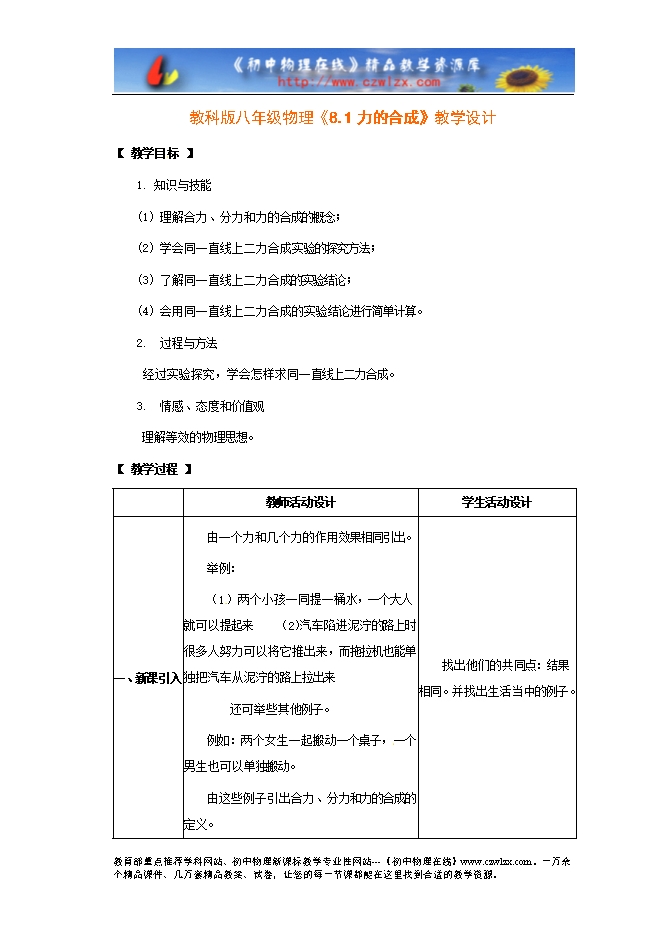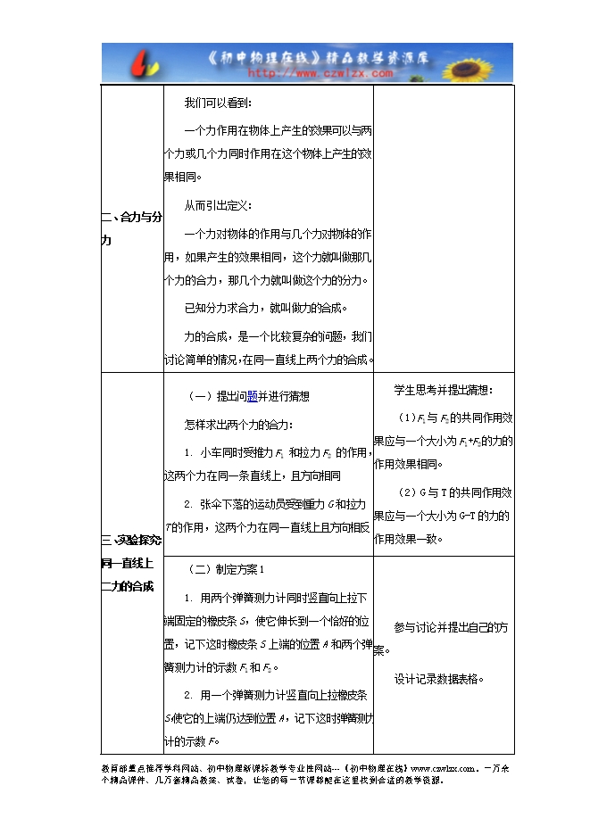 由这些例子引出合力、分力和力的合成的定义。 找出他们的共同点:结果相同。并找出生活当中的例子。