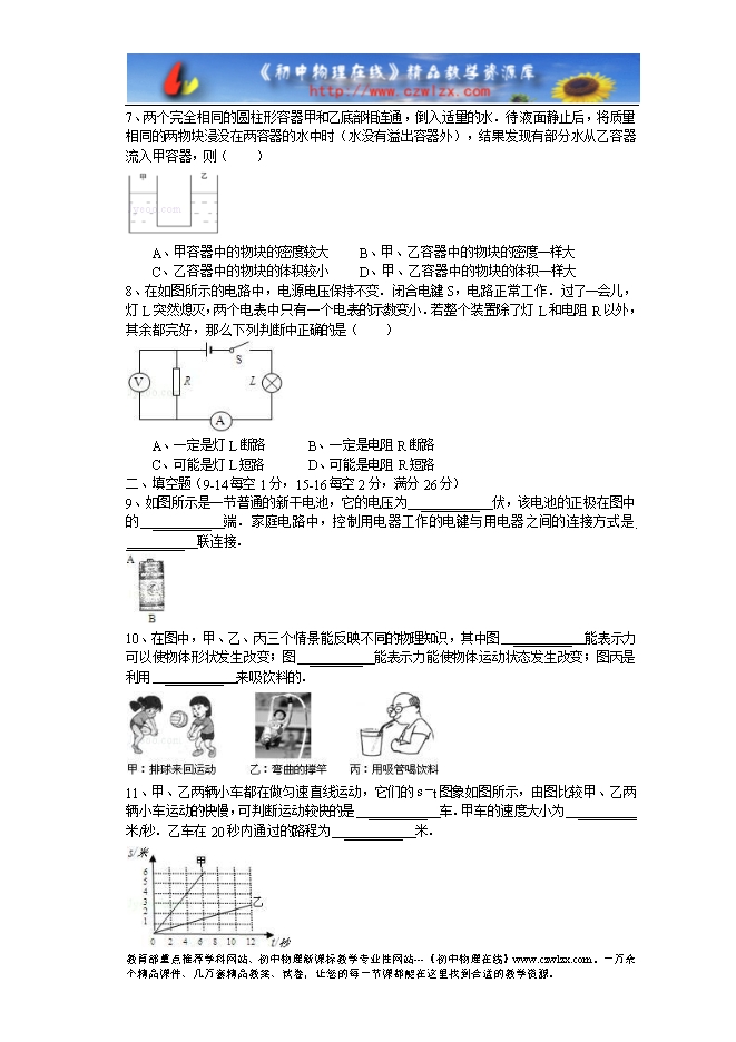 A、甲容器中的物块的密度较大 B、甲、乙容器中的物块的密度一样大