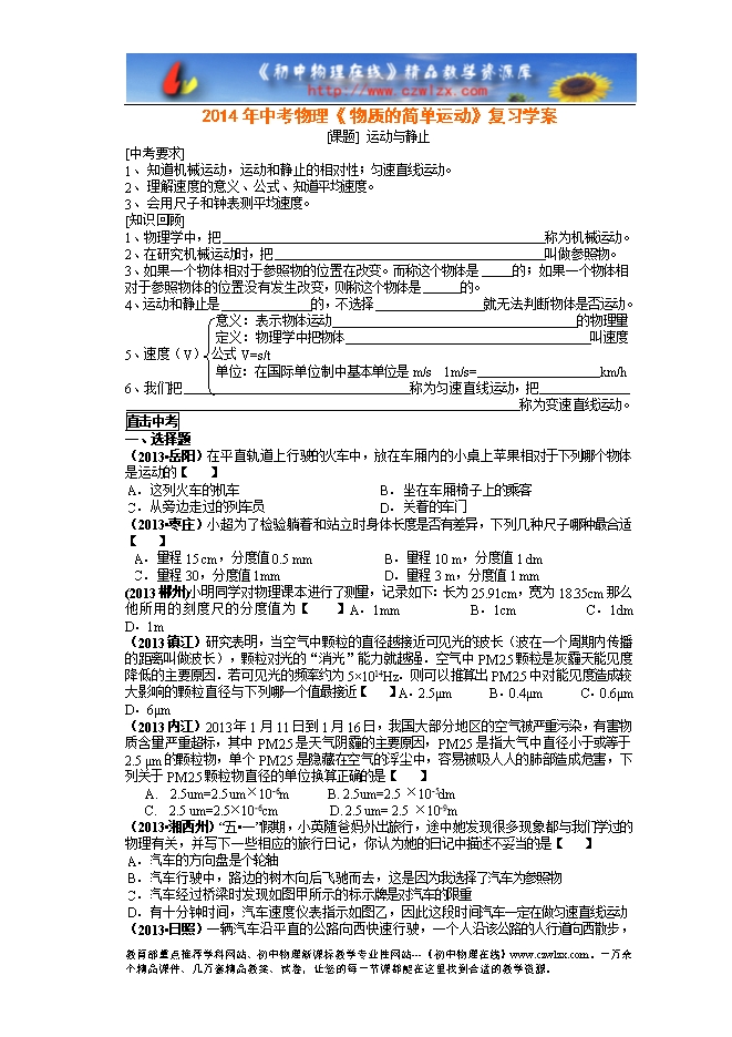 1、 知道机械运动,运动和静止的相对性;匀速直线运动。
