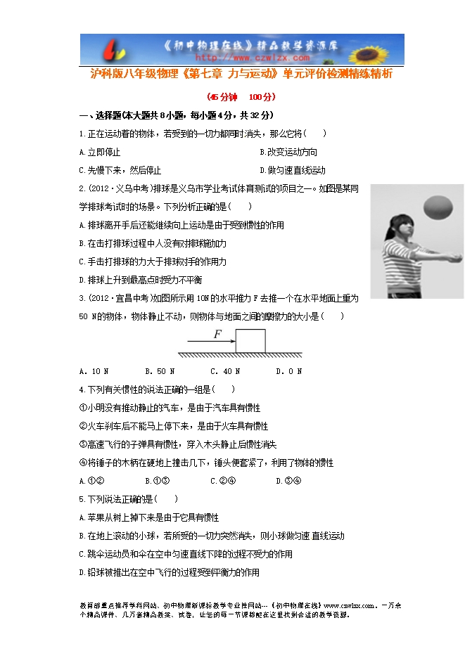 沪科版八年级物理《第七章 力与运动》单元评价检测精练精析