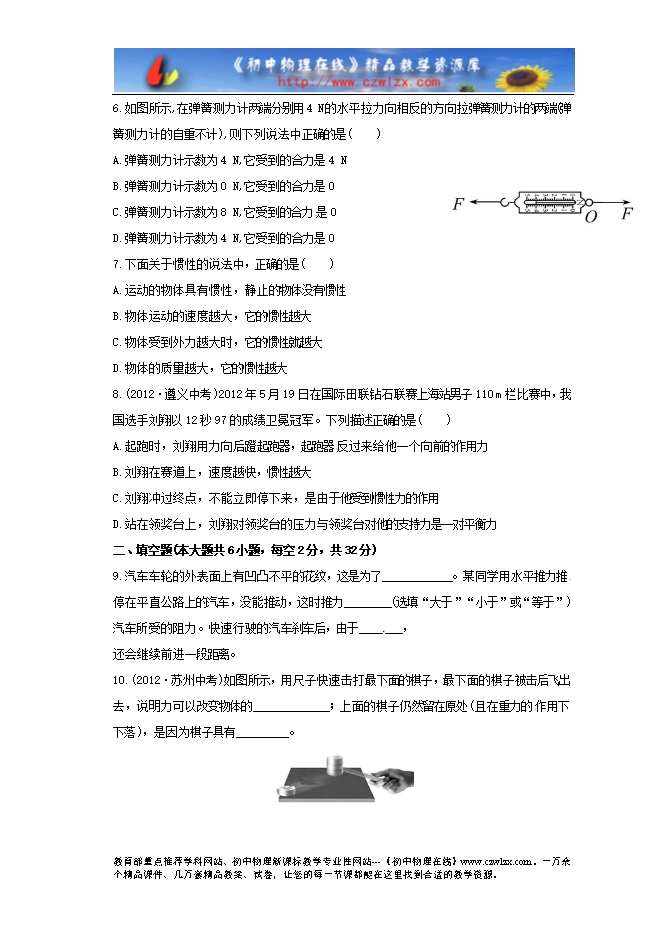 3.(2012?宜昌中考)如图所示,用10 N的水平推力F去推一个在水平地面上重为50 N的物体,物体静止不动,则物体与地面之间的摩擦力的大小是( )