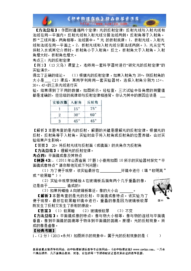 常以填空题、选择题、作图题、实验题的形式出现,例如:对反射定律的实验验证可以通过实验题的形式进行考查。对反射现象和反射光路可以通过作图题进行考查。平面镜的成像的特点可以通过实验或选择题的形式进行考查。