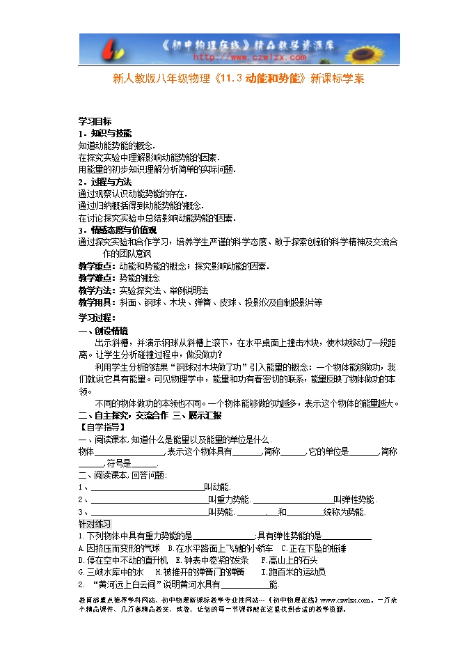新人教版八年级物理《11.3动能和势能》新课标学案