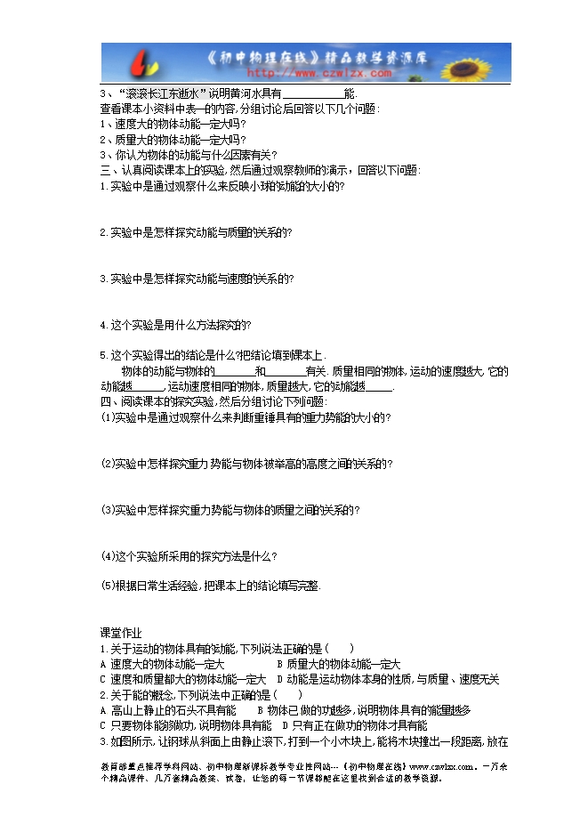 利用学生分析的结果“钢球对木块做了功”引入能量的概念:一个物体能够做功,我们就说它具有能量。可见物理学中,能量和功有着密切的联系,能量反映了物体做功的本领。
