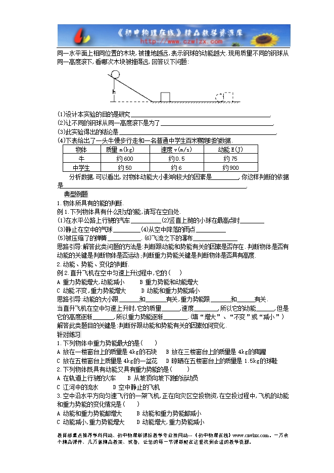 教学重点:动能和势能的概念;探究影响动能的因素.