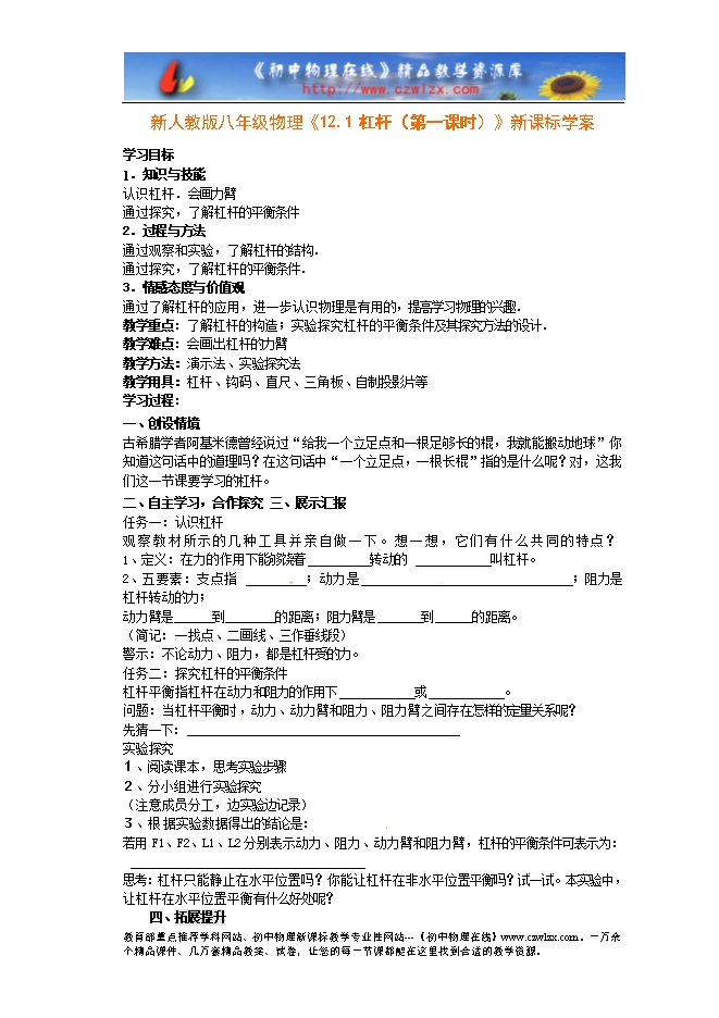 新人教版八年级物理《12.1杠杆(第一课时)》新课标学案