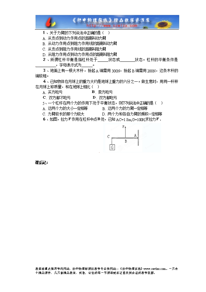 教学重点:了解杠杆的构造;实验探究杠杆的平衡条件及其探究方法的设计.