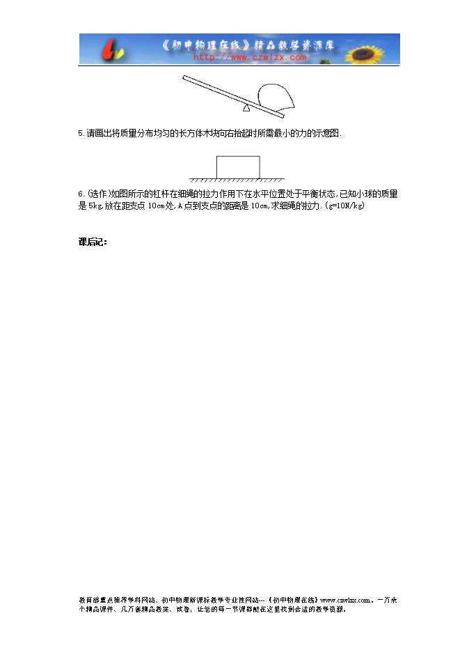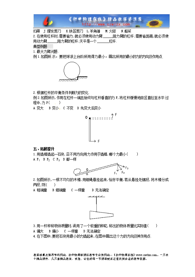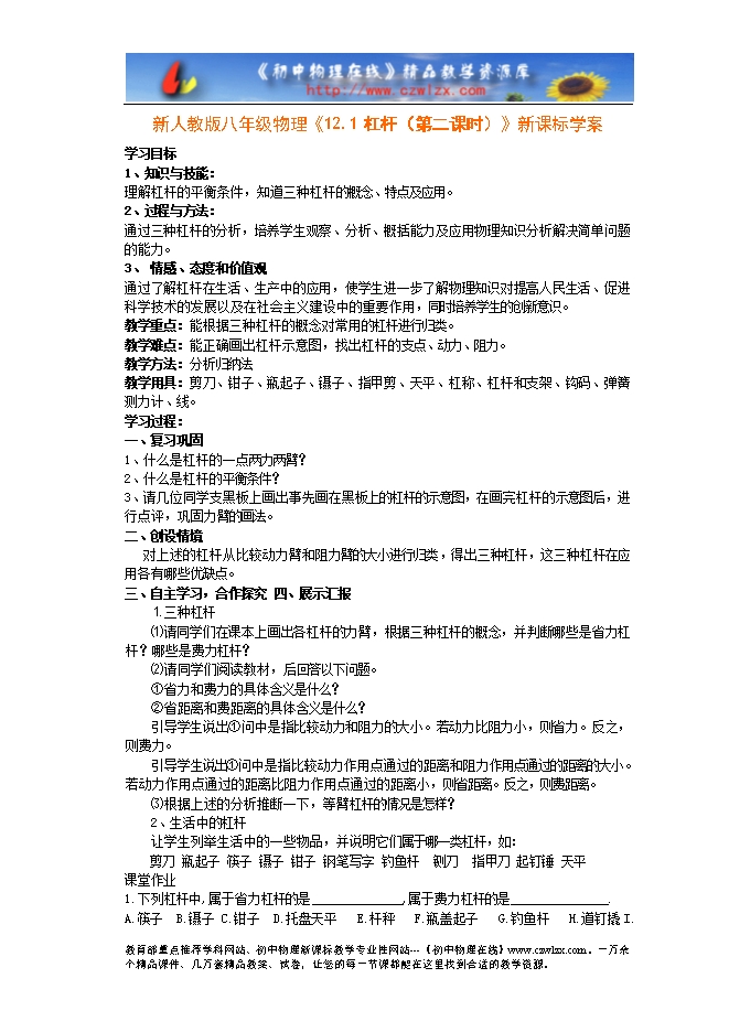 教学用具:剪刀、钳子、瓶起子、镊子、指甲剪、天平、杠称、杠杆和支架、钩码、弹簧测力计、线。