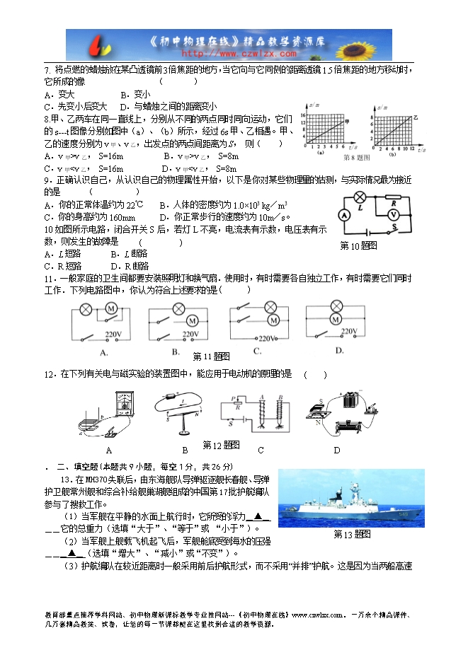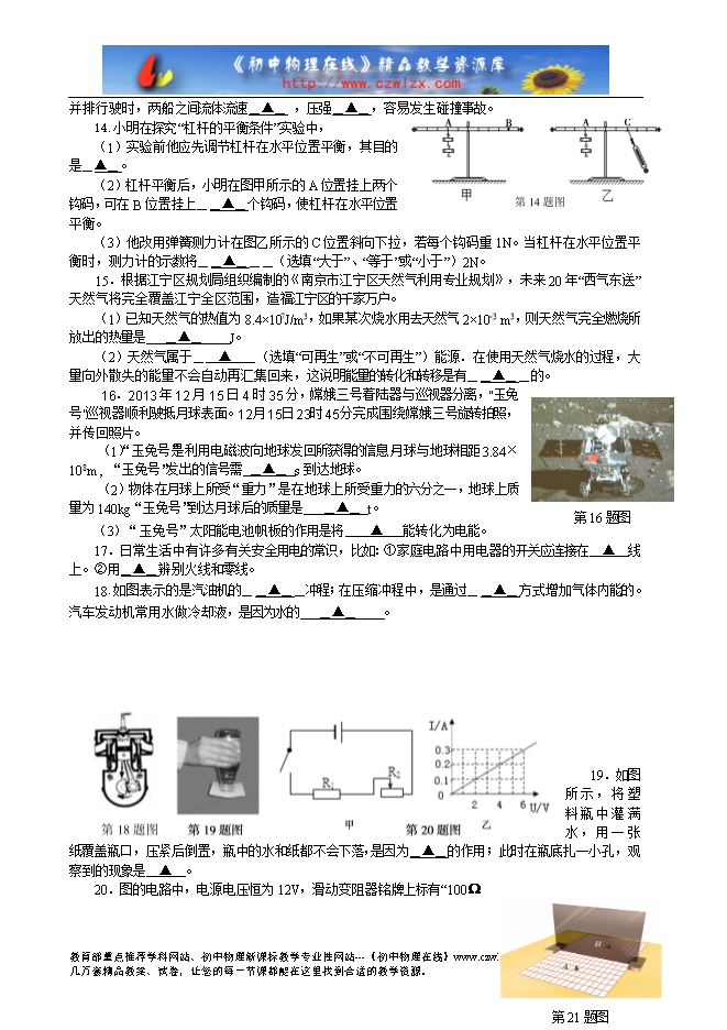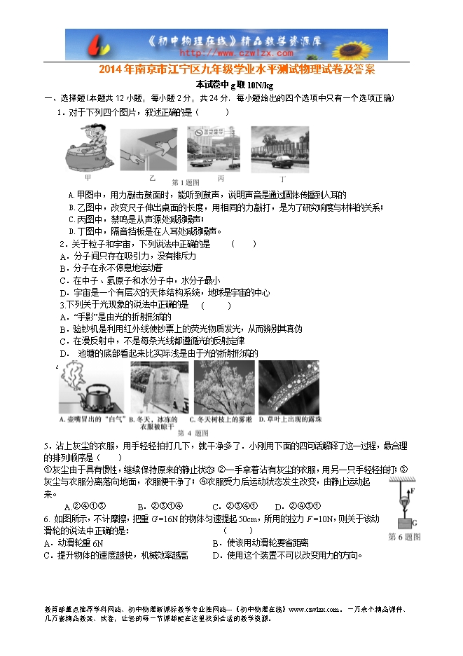 2014年南京市江宁区九年级学业水平测试物理试卷及答案