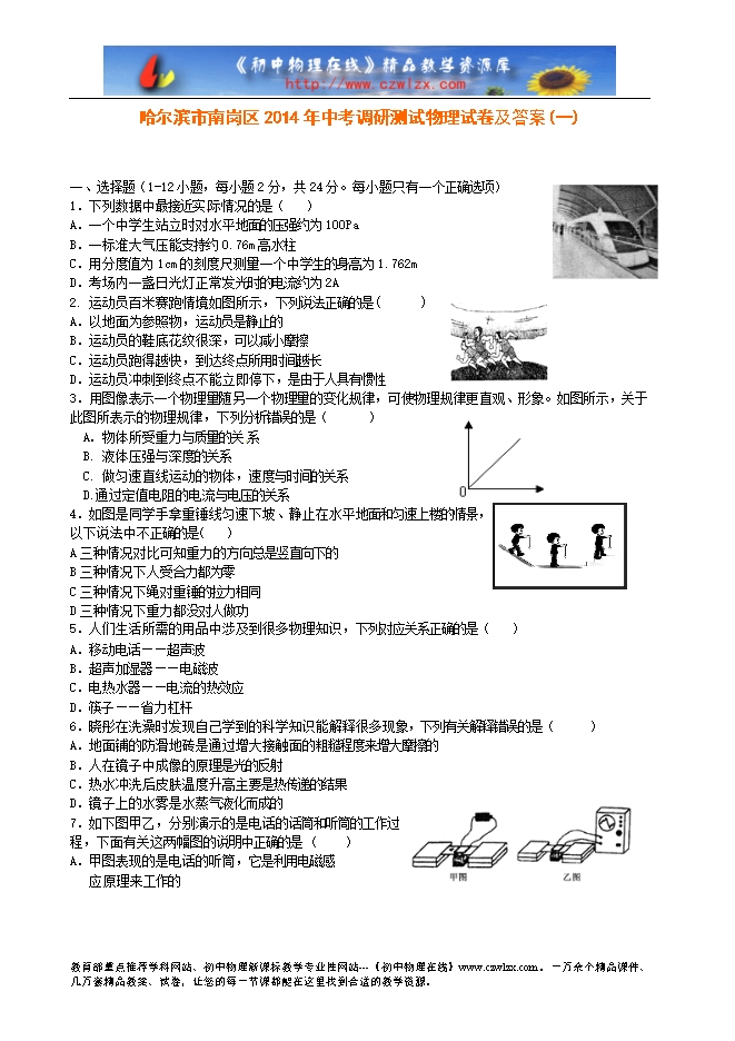 哈尔滨市南岗区2014年中考调研测试物理试卷及答案(一)