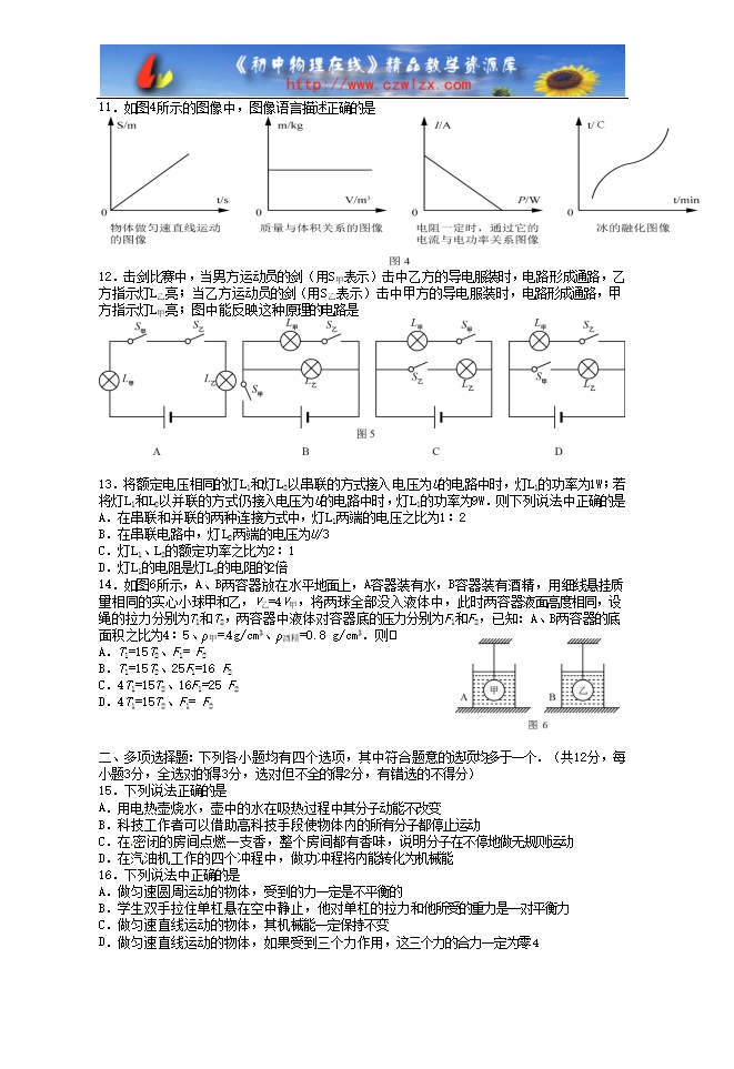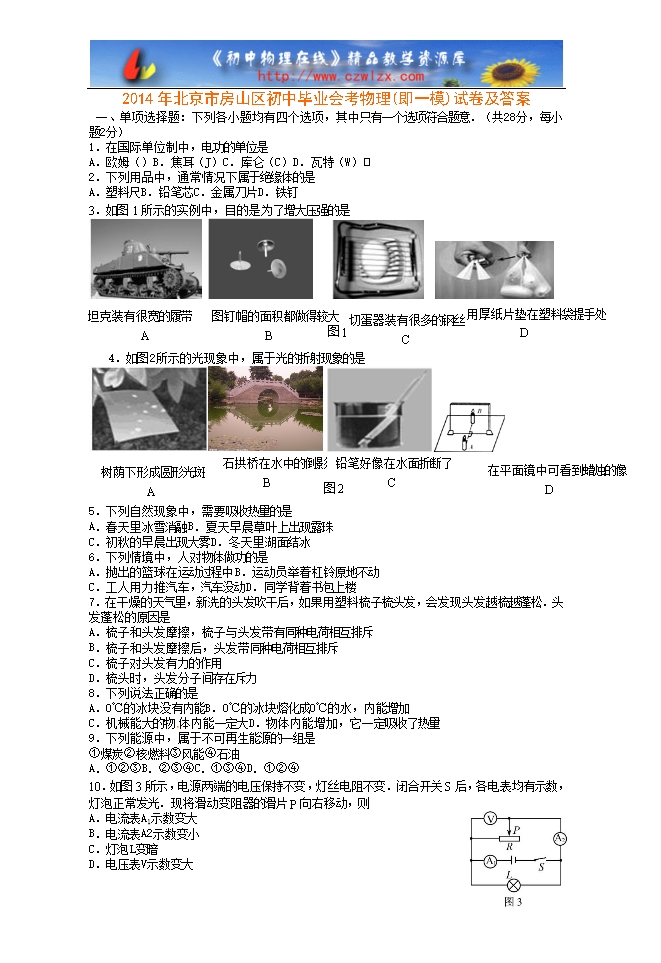 2014年北京市房山区初中毕业会考物理(即一模)试卷及答案
