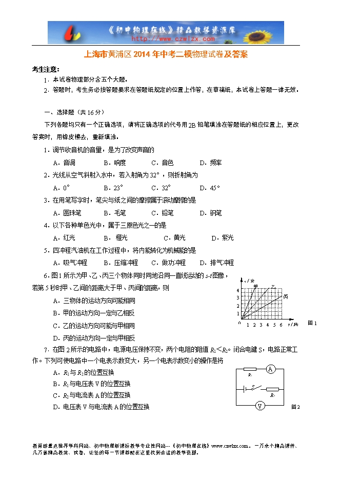 6.图1所示为甲、乙、丙三个物体同时同地沿同一直线运动的s-t图像,若第5秒时甲、乙间的距离大于甲、丙间的距离,则