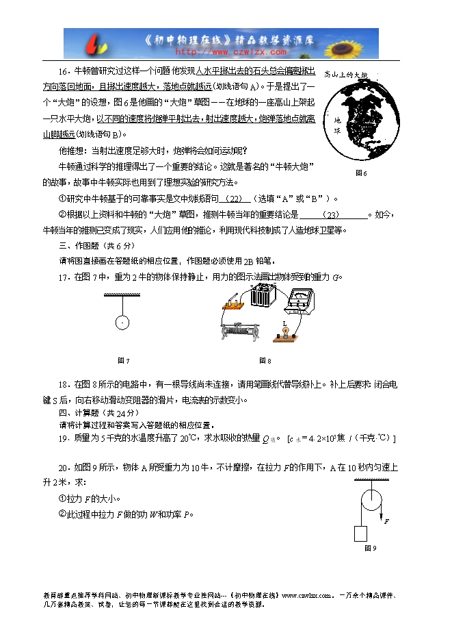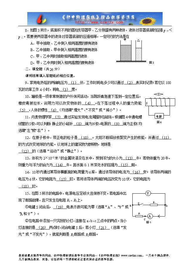 7.在图2所示的电路中,电源电压保持不变,两个电阻的阻值R1<R2。闭合电键S,电路正常工作。下列可使电路中一个电表示数变大,另一个电表示数变小的操作是将