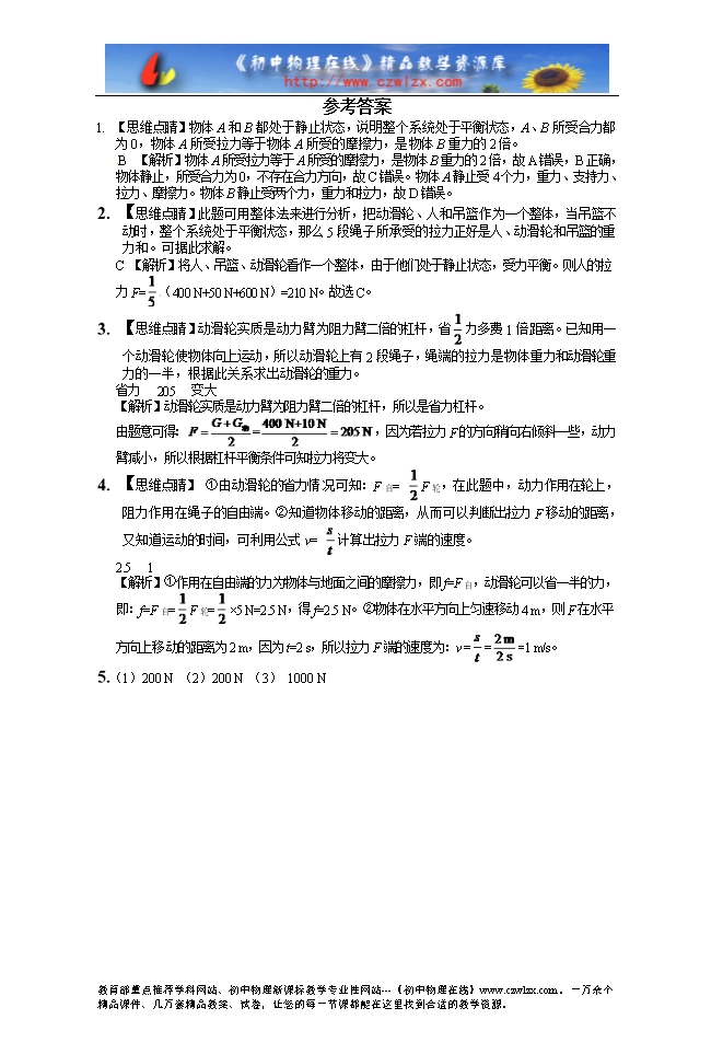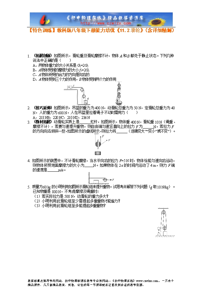 【内容简介】1. ﹙拓展创新﹚如图所示,滑轮重及滑轮摩擦不计,物体A和B都处于静止状态。下列几种说法中正确的是( )
