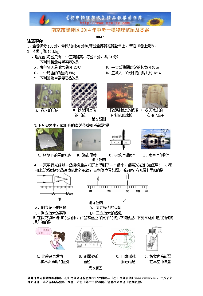 南京市建邺区2014年中考一模物理试题及答案