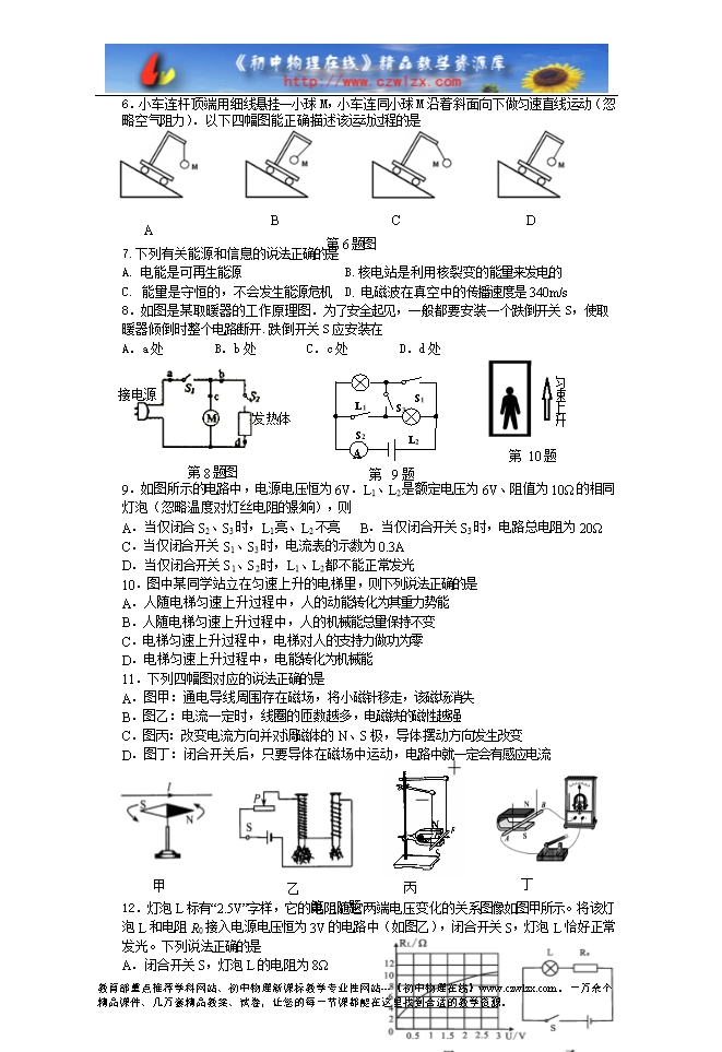 6.小车连杆顶端用细线悬挂一小球M,小车连同小球M沿着斜面向下做匀速直线运动(忽略空气阻力).以下四幅图能正确描述该运动过程的是