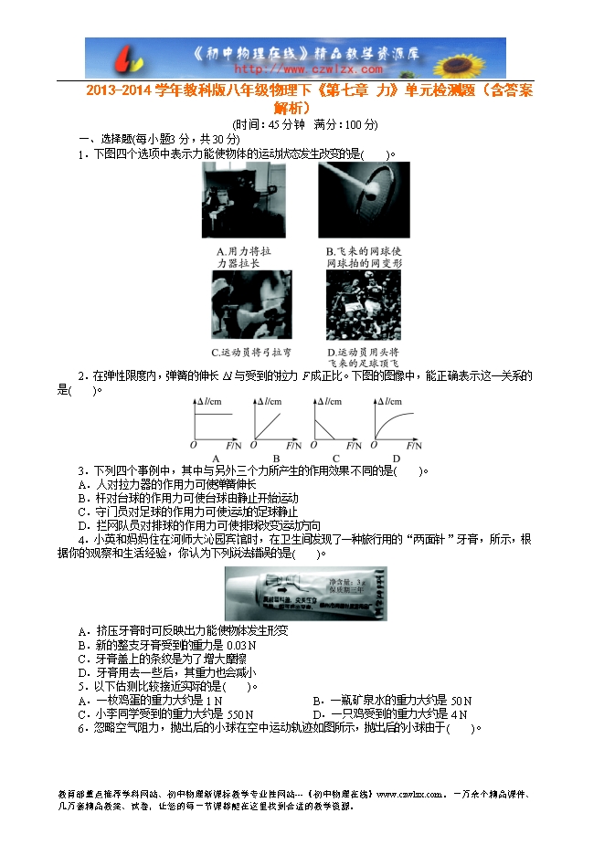 2013-2014学年教科版八年级物理下《第七章 力》单元检测题(含答案解析)