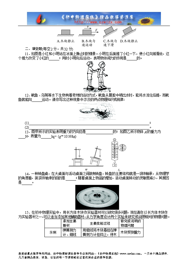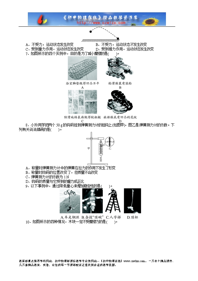 1.下图四个选项中表示力能使物体的运动状态发生改变的是( )。
