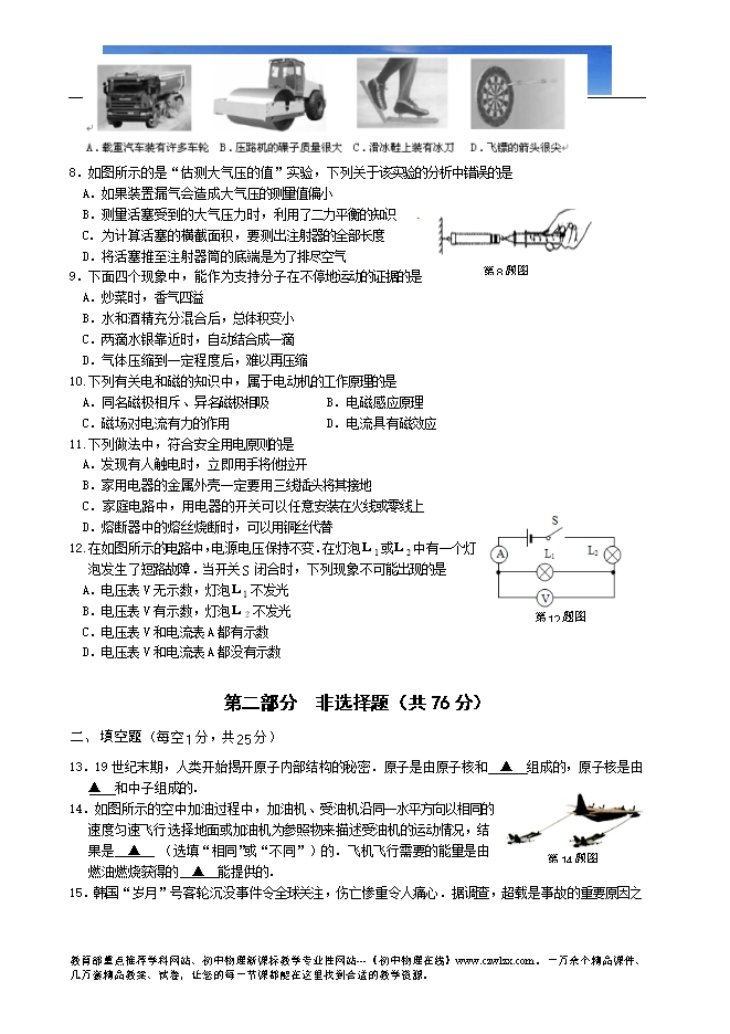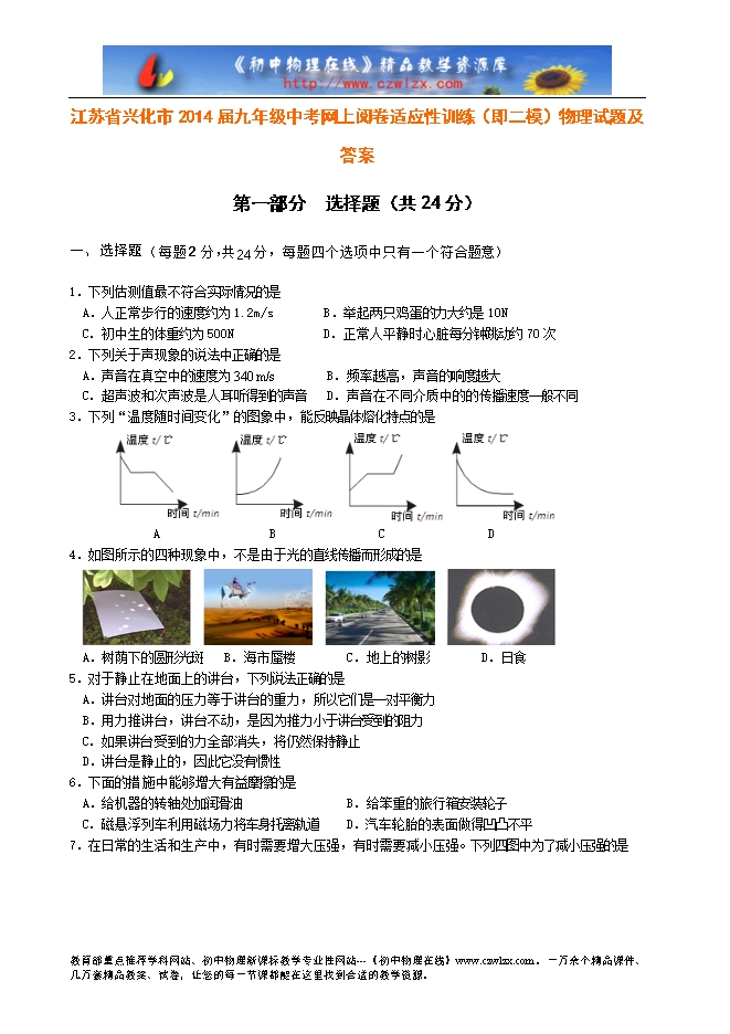 江苏省兴化市2014届九年级中考网上阅卷适应性训练(即二模)物理试题及答案
