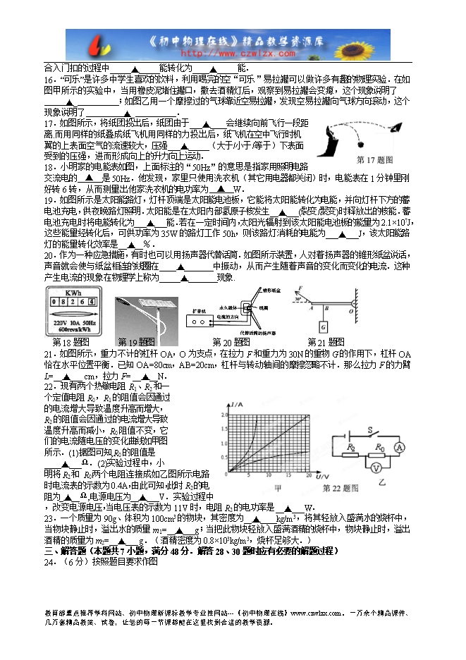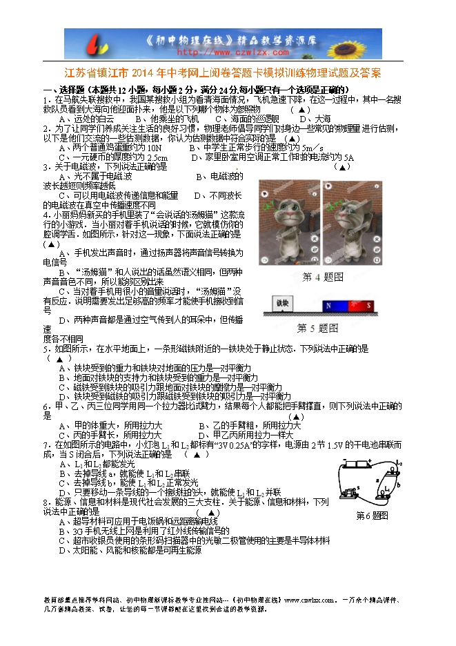 江苏省镇江市2014年中考网上阅卷答题卡模拟训练物理试题及答案
