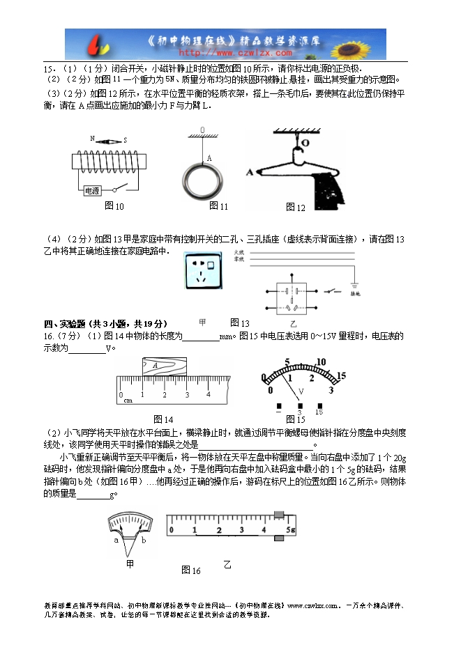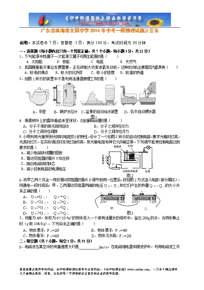 广东省珠海市文园中学2014年中考一模物理试题及答案
