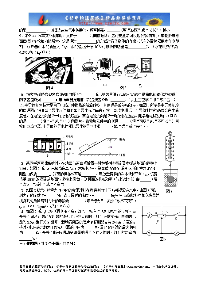6.将甲乙两个完全一样的滑动变阻器的滑片P调节到同一位置后,按如图3方式连入电路(部分画出),则通电一段时间后,甲、乙两滑动变阻器两端的电压U甲、U乙和它们产生的热量Q甲、Q乙的大小关系正确的是( )