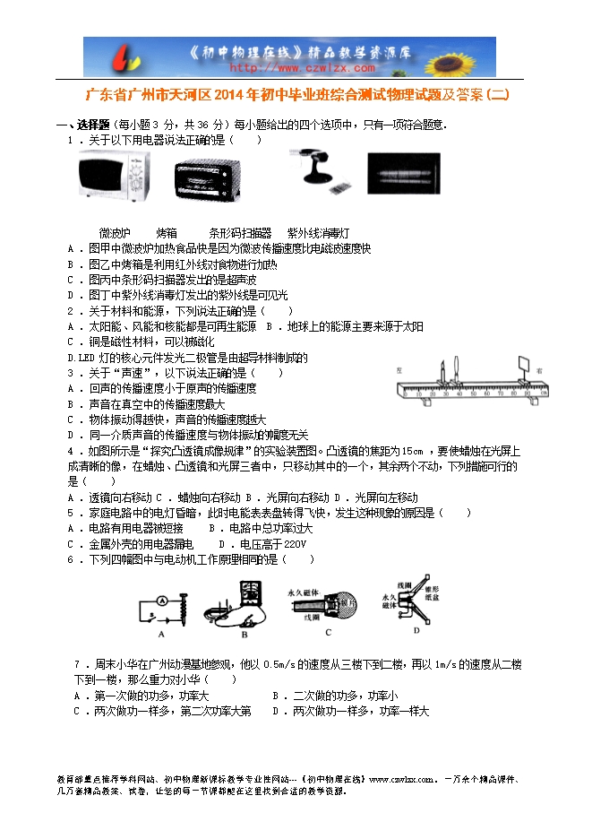 广东省广州市天河区2014年初中毕业班综合测试物理试题及答案(二)