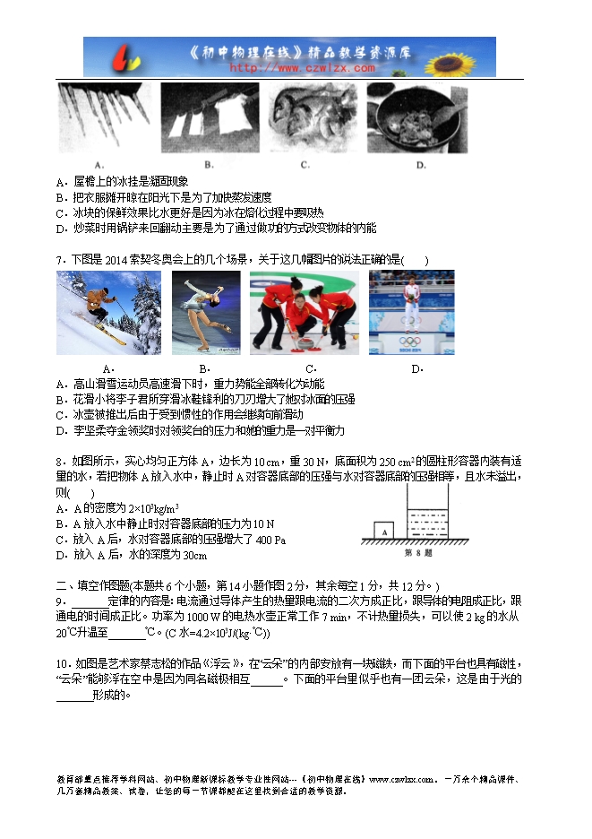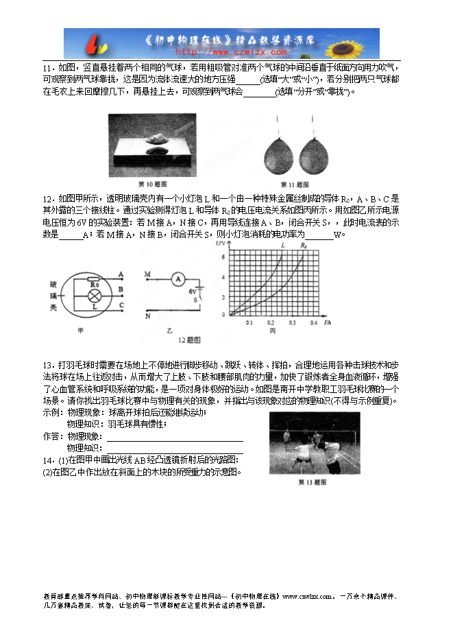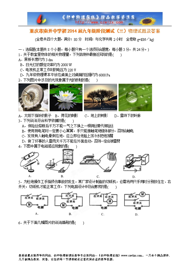 重庆市南开中学初2014届九年级阶段测试(三)物理试题及答案