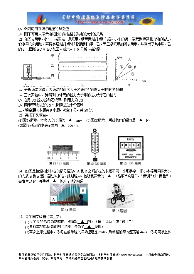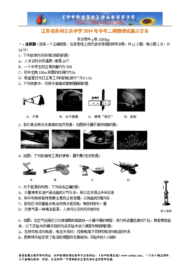 江苏省苏州立达中学2014年中考二模物理试题及答案