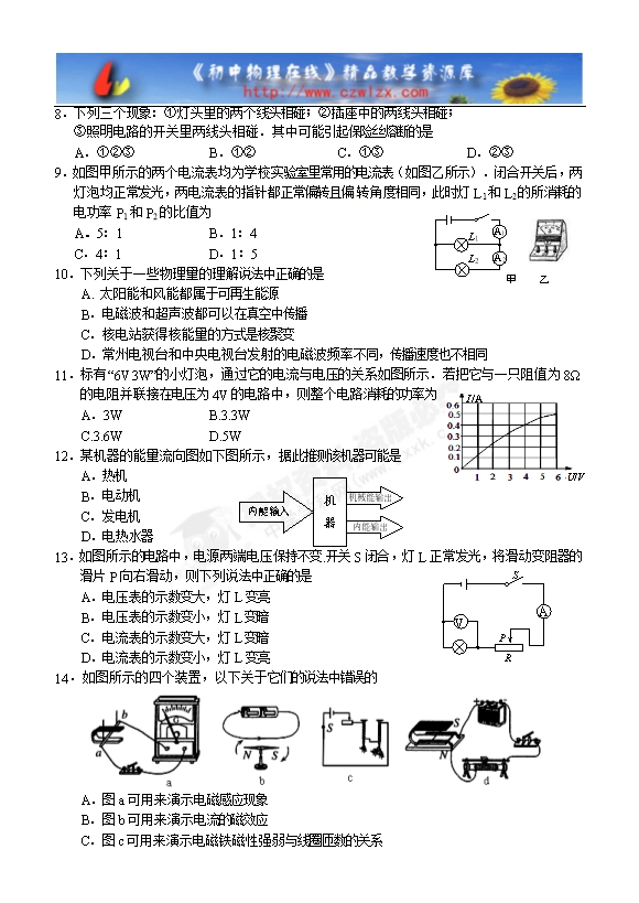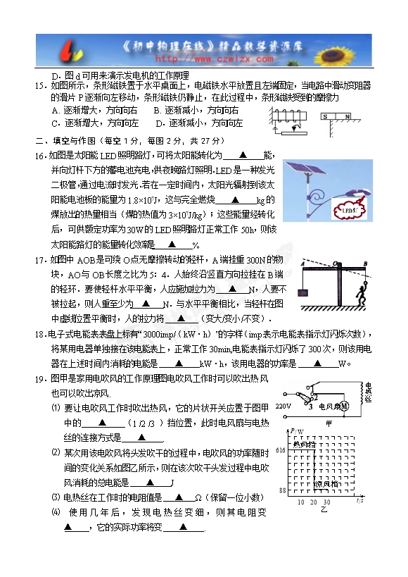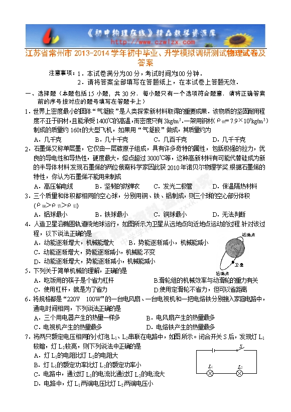 江苏省常州市2013-2014学年初中毕业、升学模拟调研测试物理试卷及答案