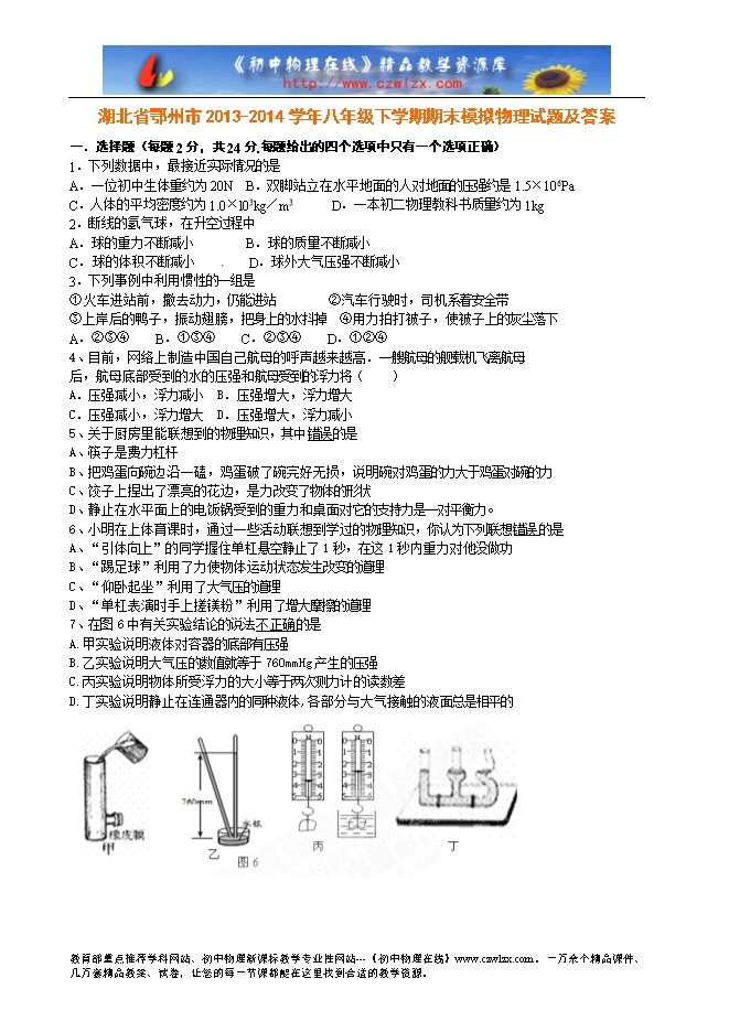 湖北省鄂州市2013-2014学年八年级下学期期末模拟物理试题及答案