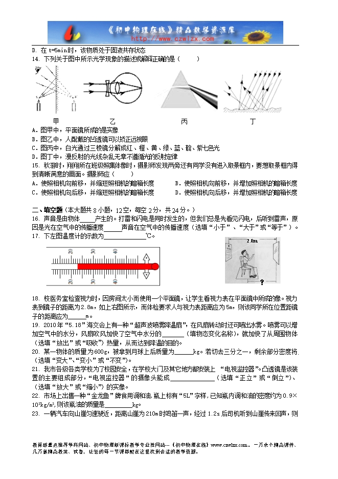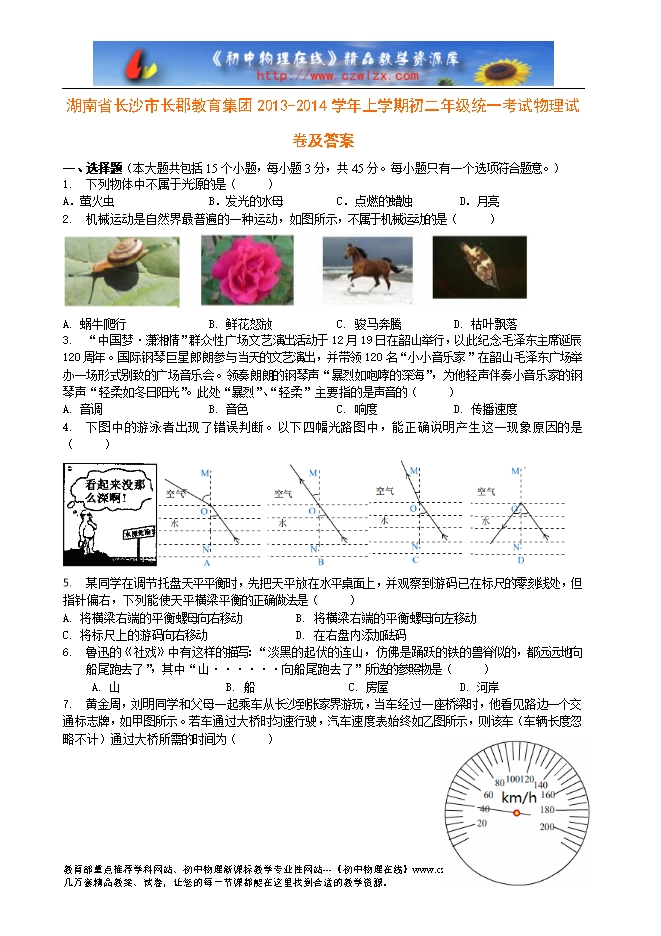 湖南省长沙市长郡教育集团2013-2014学年上学期初二年级统一考试物理试卷及答案