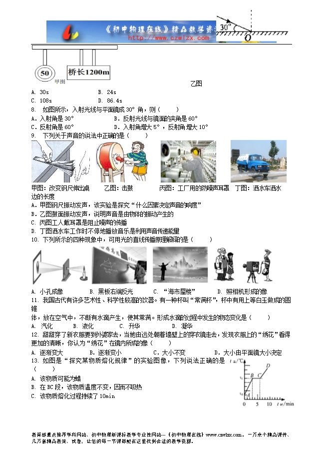 7. 黄金周,刘明同学和父母一起乘车从长沙到张家界游玩,当车经过一座桥梁时,他看见路边一个交通标志牌,如甲图所示。若车通过大桥时匀速行驶,汽车速度表始终如乙图所示,则该车(车辆长度忽略不计)通过大桥所需的时间为( )