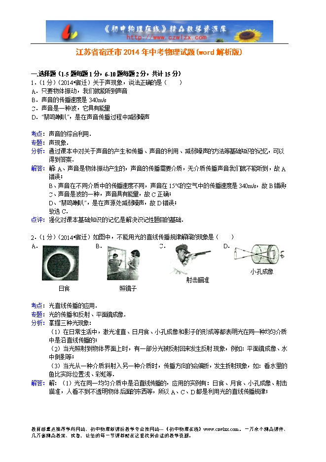 江苏省宿迁市2014年中考物理试题(word解析版)