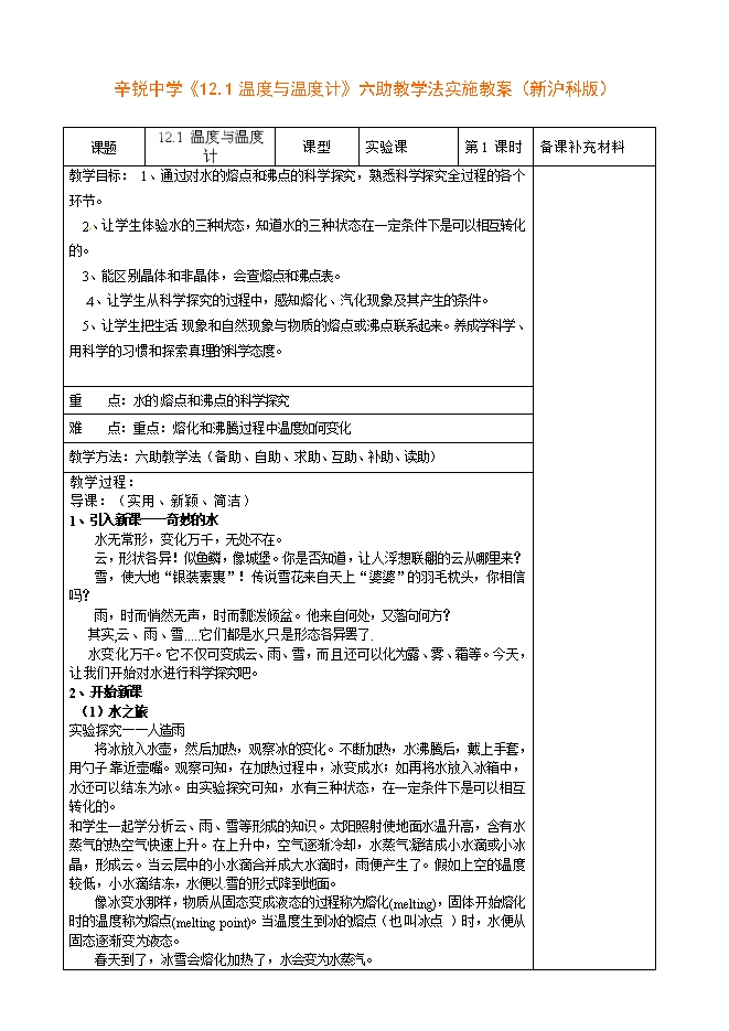 辛锐中学《12.1温度与温度计》六助教学法实施教案(新沪科版)