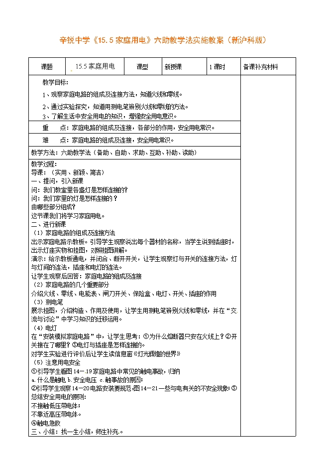 辛锐中学《15.5家庭用电》六助教学法实施教案(新沪科版)
