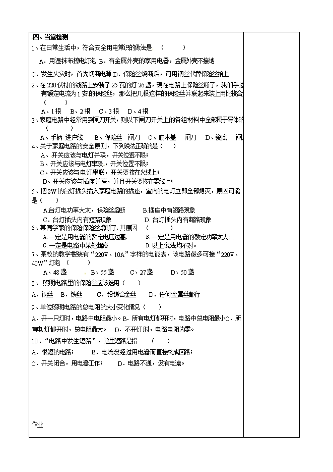 在“安装模拟家庭电路”中,让学生 思考:①为什么熔断器只安在火线上?②开关接在了哪里?③电灯与插座是怎样连接的。